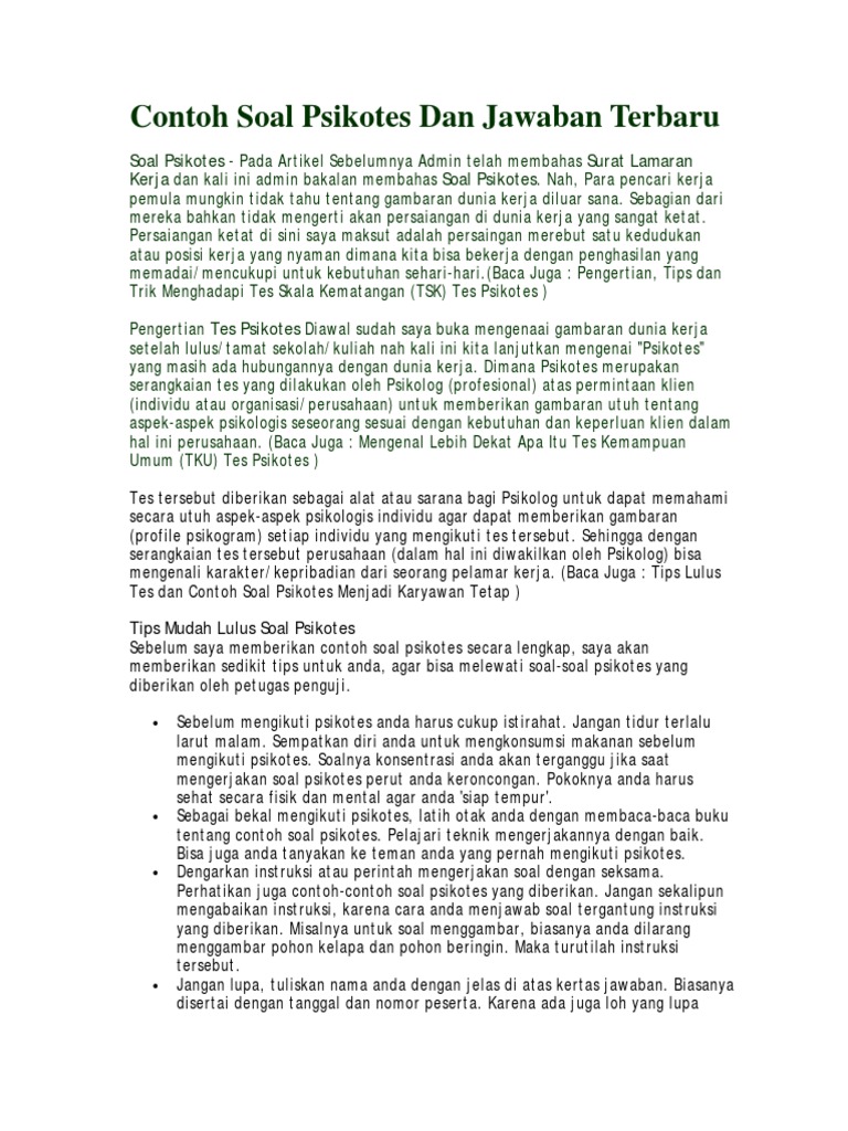 Beberapa hari sebelum mengikuti psikotes usahakan hilangkan beban pikiran. Mar 03, 2018 · contoh soal tes assessment. Tentunya, dengan mengetahui kemampuan logika seseorang dari pelaksanaan tes, maka akan bisa ditarik kesimpulan berkualitas atau tidaknya peserta tes tersebut.untuk itulah dibutuhkan contoh soal logika dan jawabannya sebagai bahan untuk anda guna mengetahui bentuk dari soal logika yang sebenarnya. Jul 03, 2021 · kabar baiknya adalah psikotest ini bisa anda pelajari. Tetapi menurut saya tes ini terlalu banyak membuat soal yang mengulang, sehingga soal yang banyak itu membuat saya agak malas untuk membaca dan mengerjakannya.